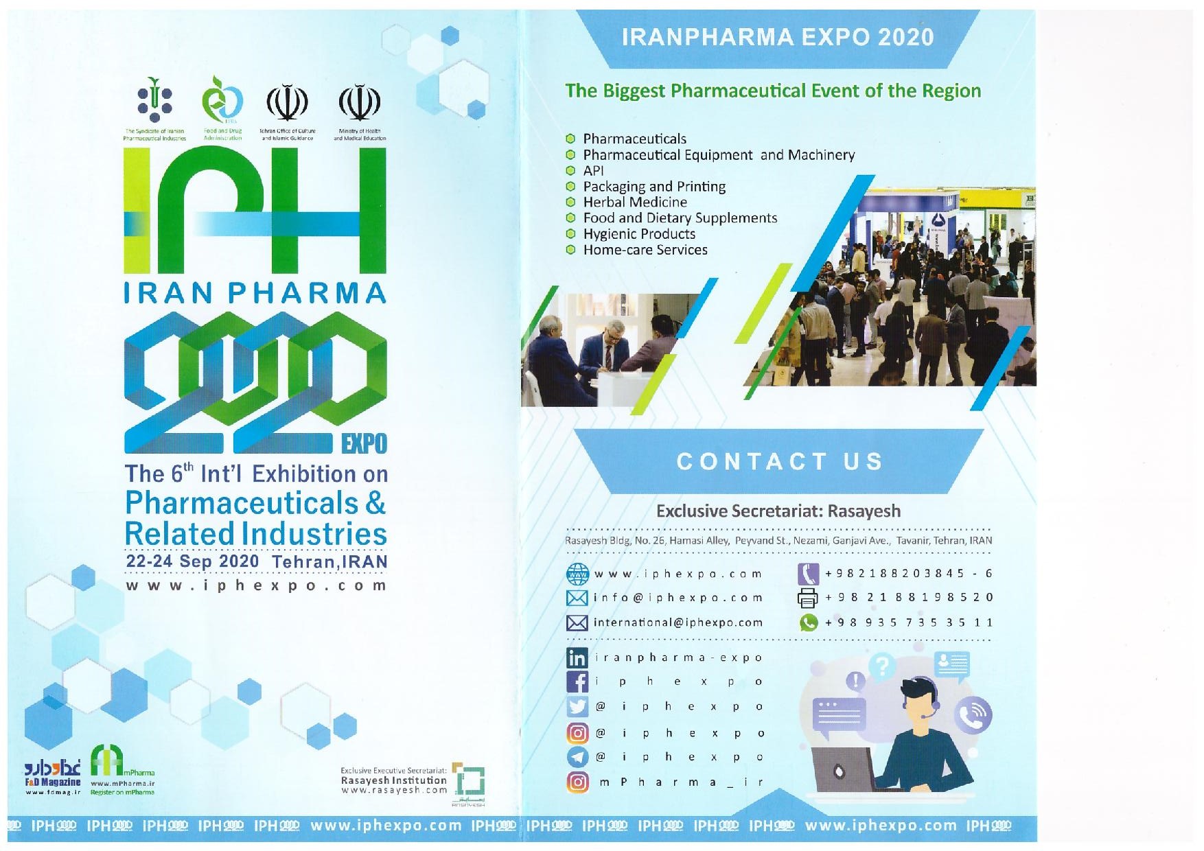 IRANPHARMA EXPO 2020, like its previous editions, will be held by the Iranian Pharmaceutical Industries Syndicate, and with the collaboration of ministry of health and medical education, the Iranian Food and Drug Administration IFDA, ministry of culture and Islamic Guidance, and with the contribution of scientific and academic associations and more than 500 pharmaceutical companies.