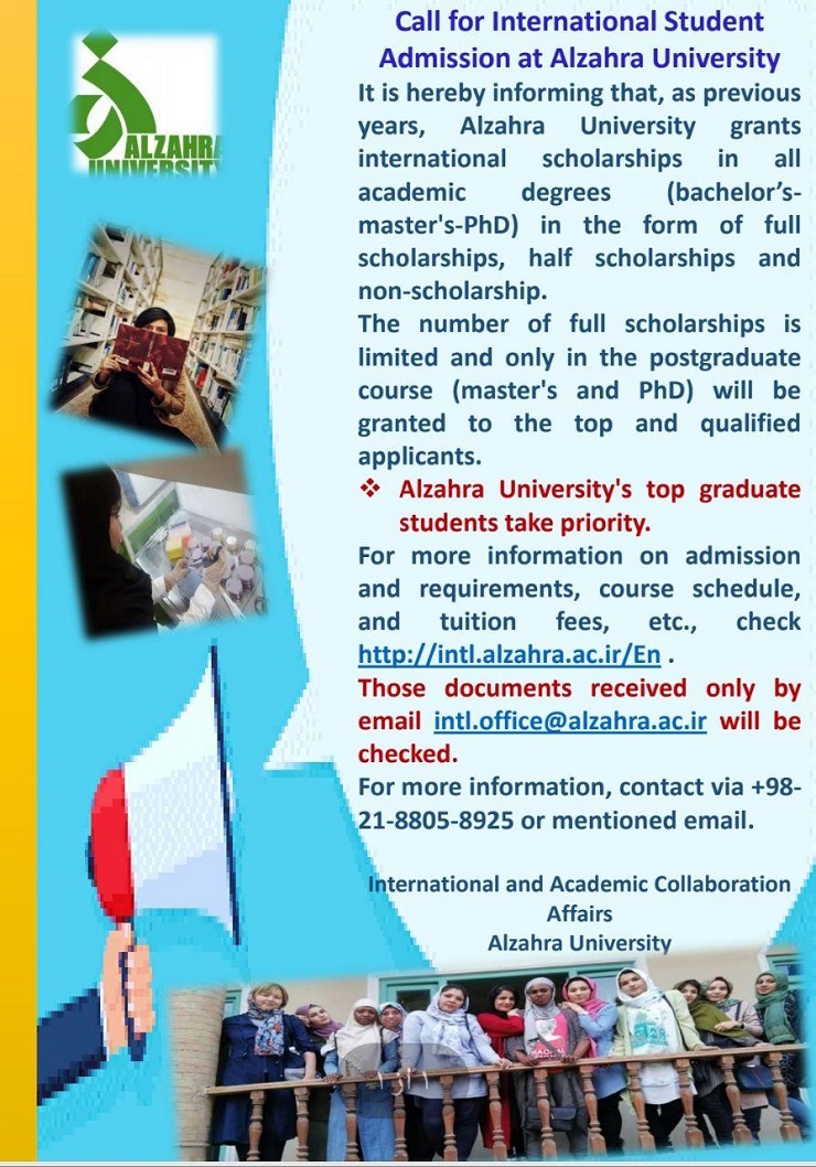 Call for International Student Admission at Alzahra University It is hereby informing that, as previous years, Alzahra University grants international scholarships in all academic degrees (bachelor’smaster's- PhD) in the form of full scholarships, half scholarships and non-scholarship. The number of full scholarships is limited and only in the postgraduate course (master's and PhD) will be granted to the top and qualified