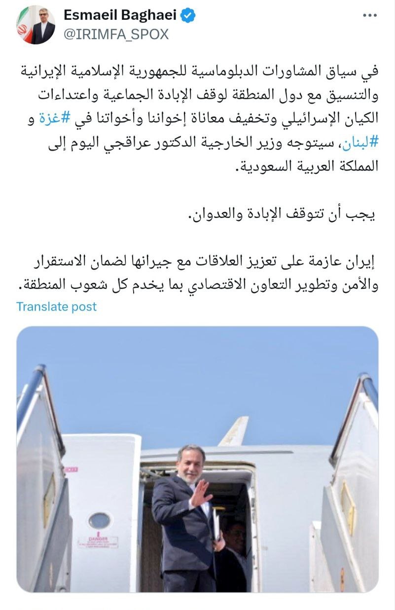 در ادامه رایزنیهای دیپلماتیک جمهوری اسلامی ایران و هماهنگی با کشورهای منطقه جهت توقف نسل کشی و تجاوزات رژیم اسرائیل و کاهش درد و رنج برادران و خواهرانمان در غزه و لبنان، دکتر عراقچی وزیر امورخارجه امروز عازم عربستان سعودی میشوند.